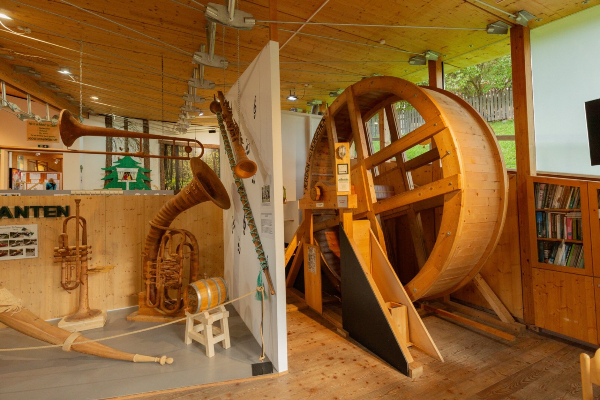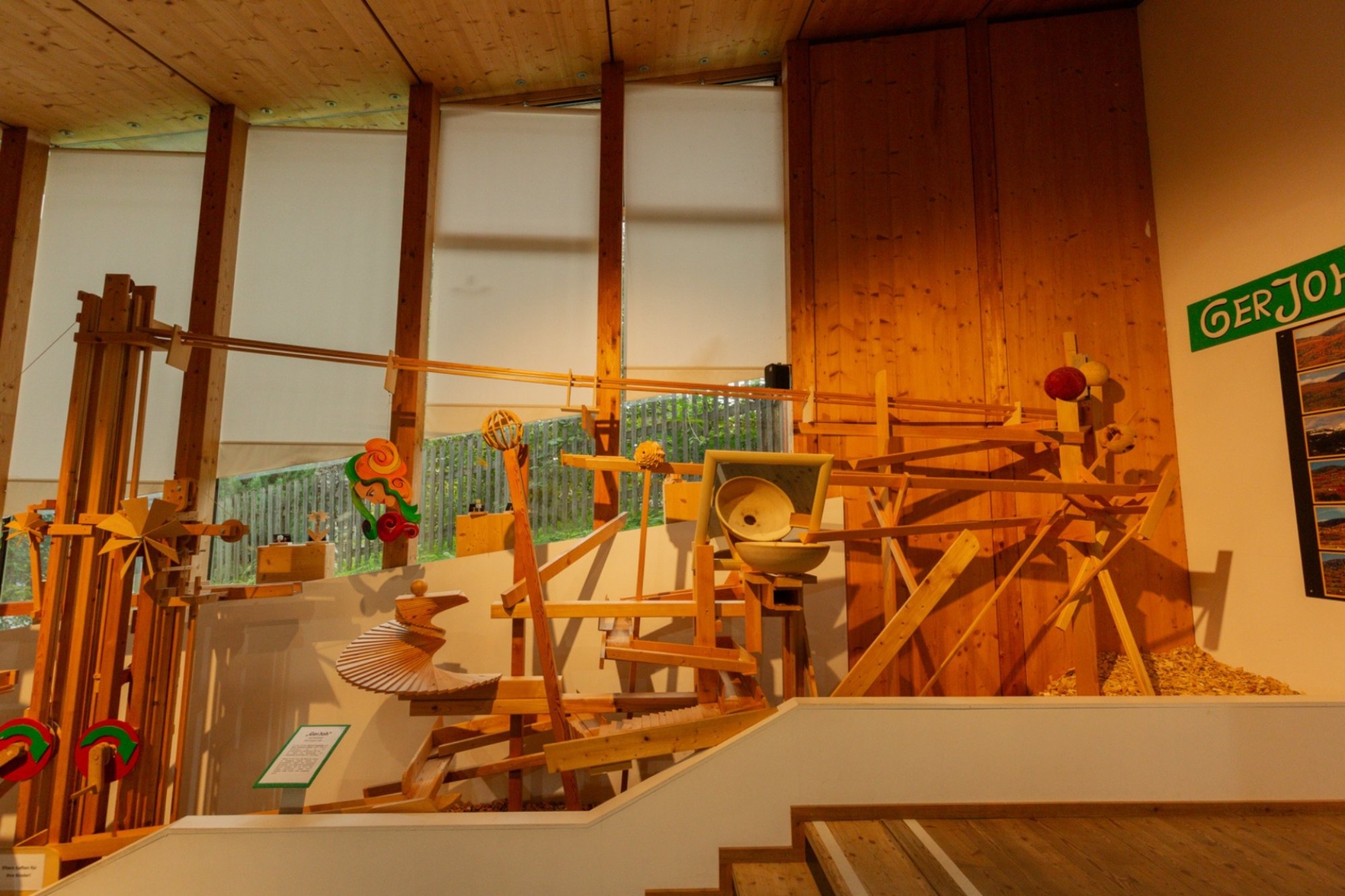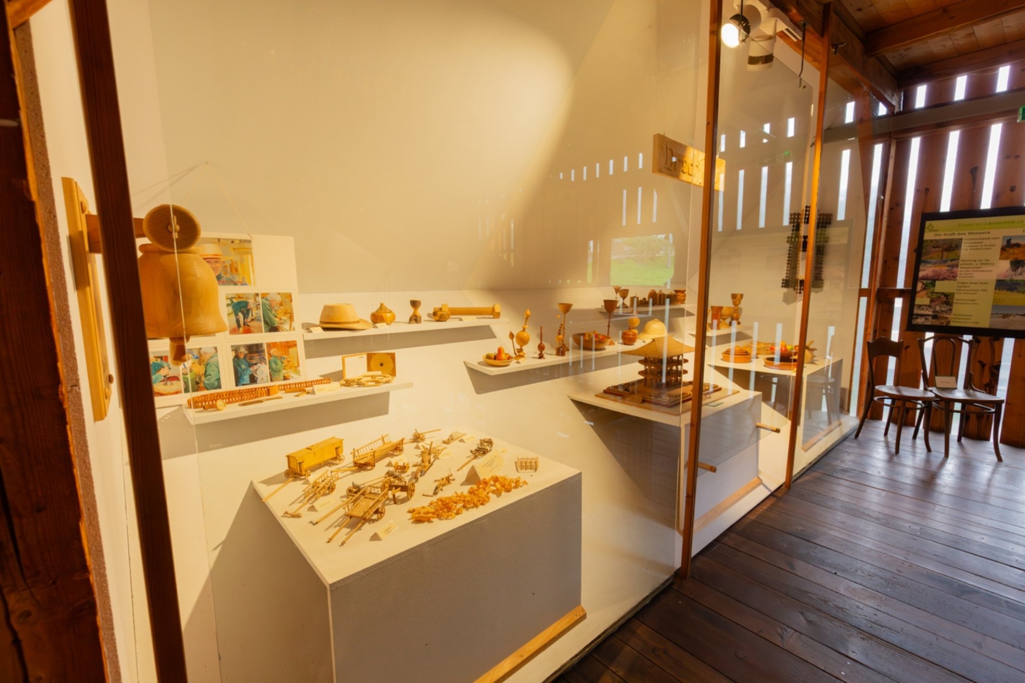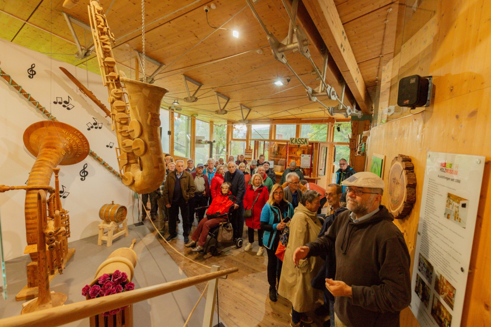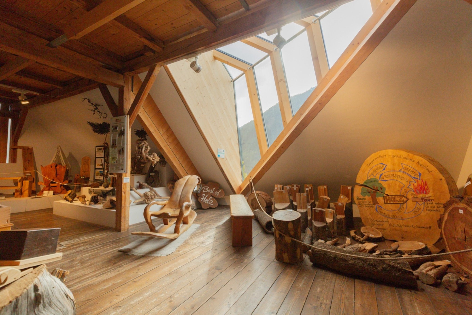 Stolz präsentiert sich das Holzmuseum mit seinem Dach und der außergewöhnlichen Dachgaube. Wie ein Diamant sticht sie aus dem Dach des Haupthauses, einem ehemaligen Rinderstall, hervor. Ein Symbol, das uns zeigen soll, dass das Traditionelle das Moderne nicht ausschließt. Bei unserem zweistündigen Aufenthalt durften wir eintauchen in eine "Holz-Erlebniswelt" auf 10.000 m² Gesamtfläche im Innen- und Außenbereich.
