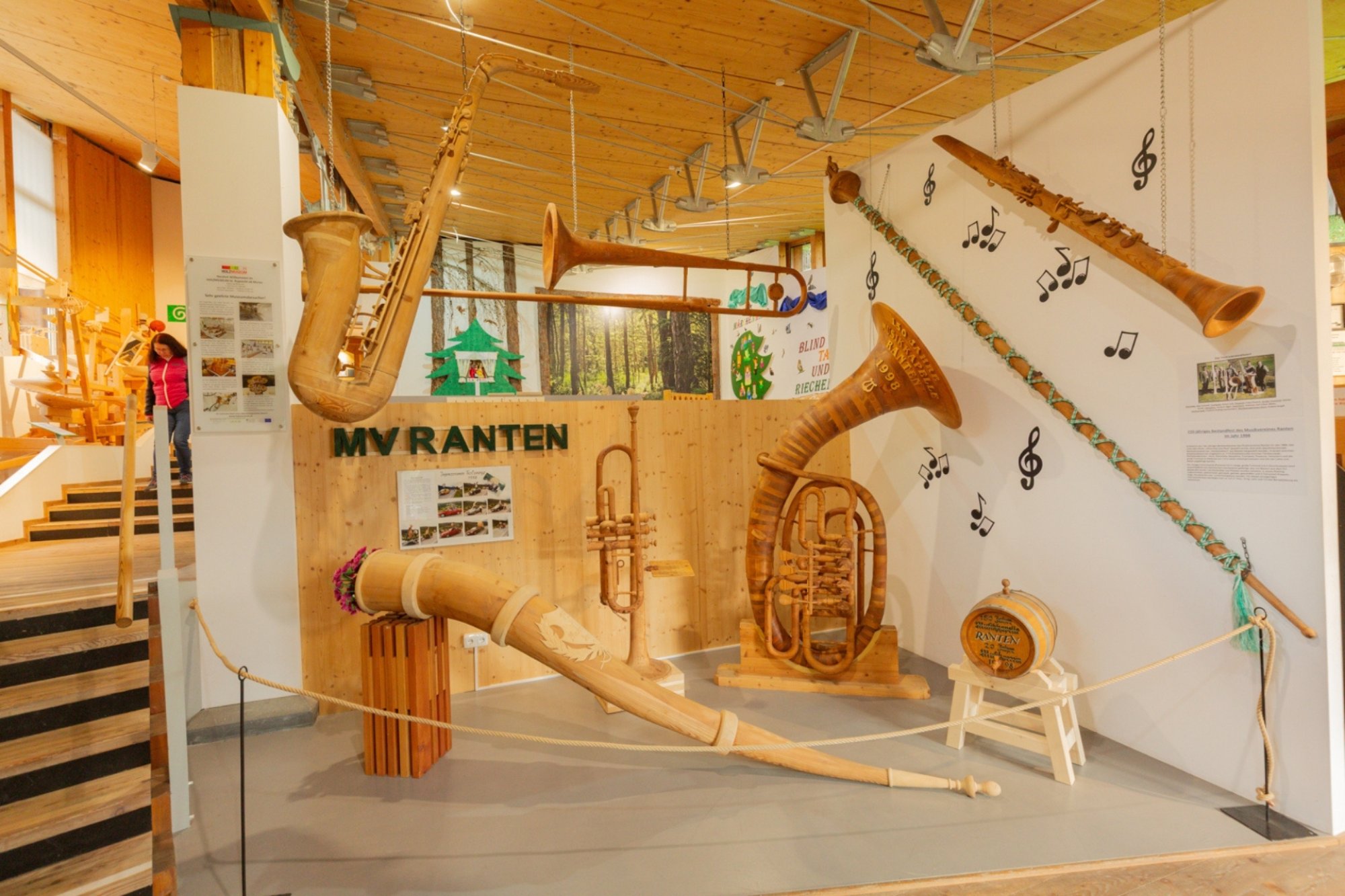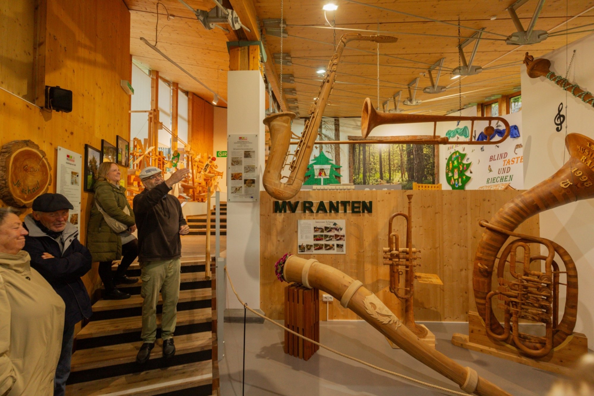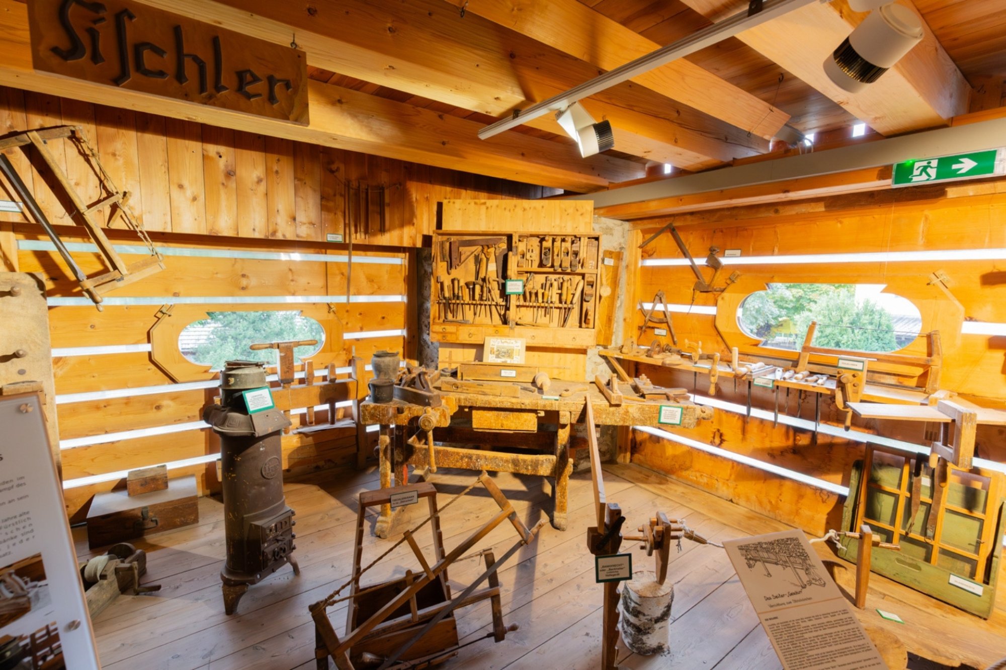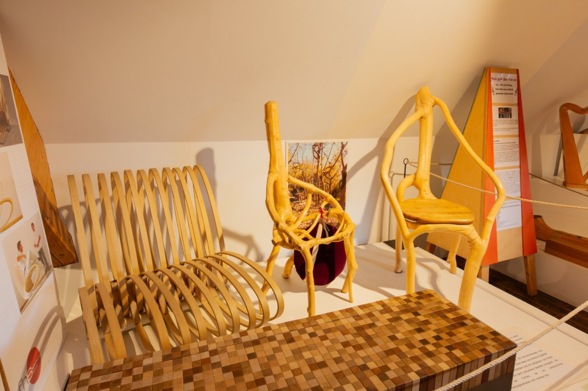 Stolz präsentiert sich das Holzmuseum mit seinem Dach und der außergewöhnlichen Dachgaube. Wie ein Diamant sticht sie aus dem Dach des Haupthauses, einem ehemaligen Rinderstall, hervor. Ein Symbol, das uns zeigen soll, dass das Traditionelle das Moderne nicht ausschließt. Bei unserem zweistündigen Aufenthalt durften wir eintauchen in eine "Holz-Erlebniswelt" auf 10.000 m² Gesamtfläche im Innen- und Außenbereich.