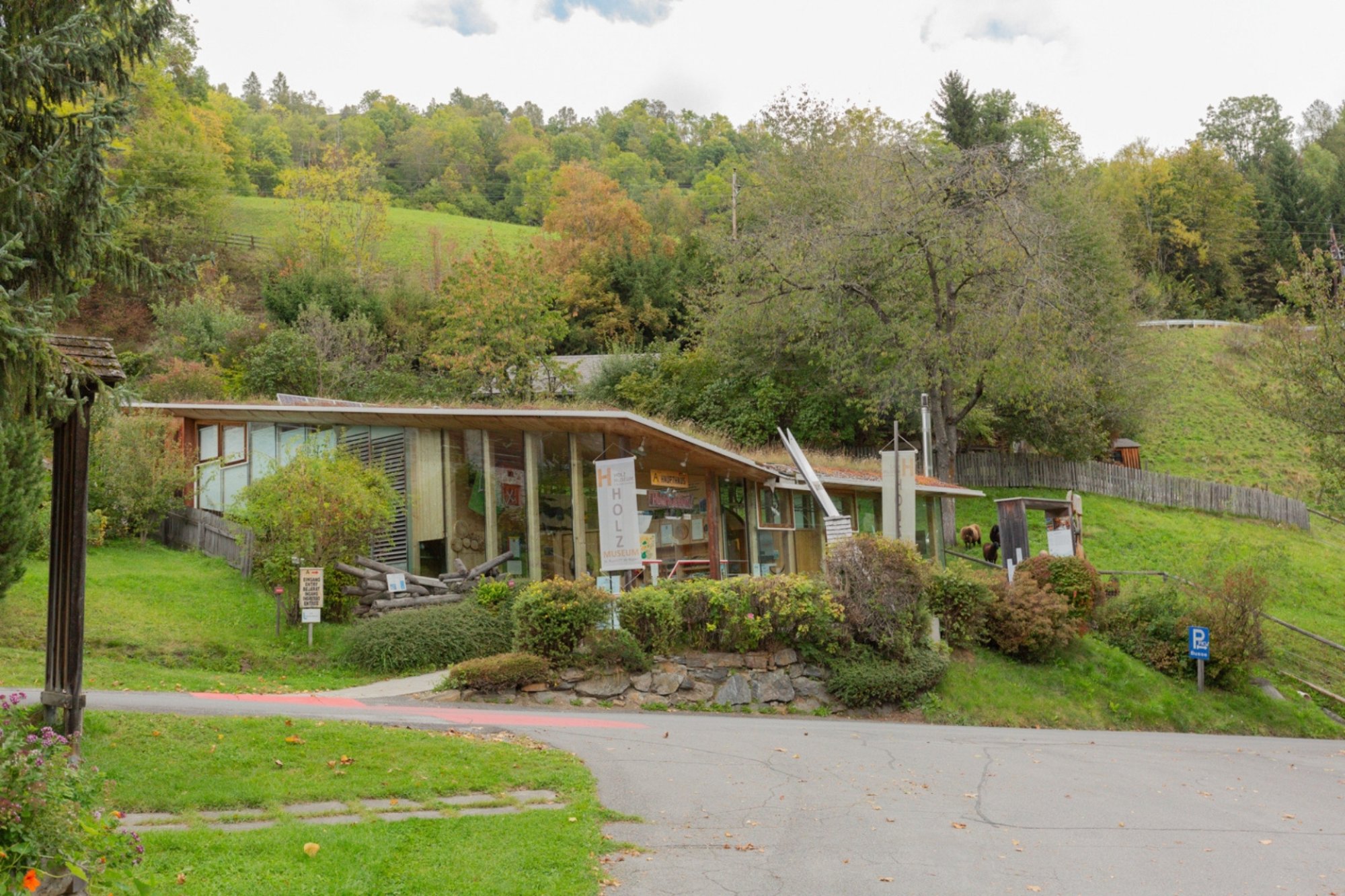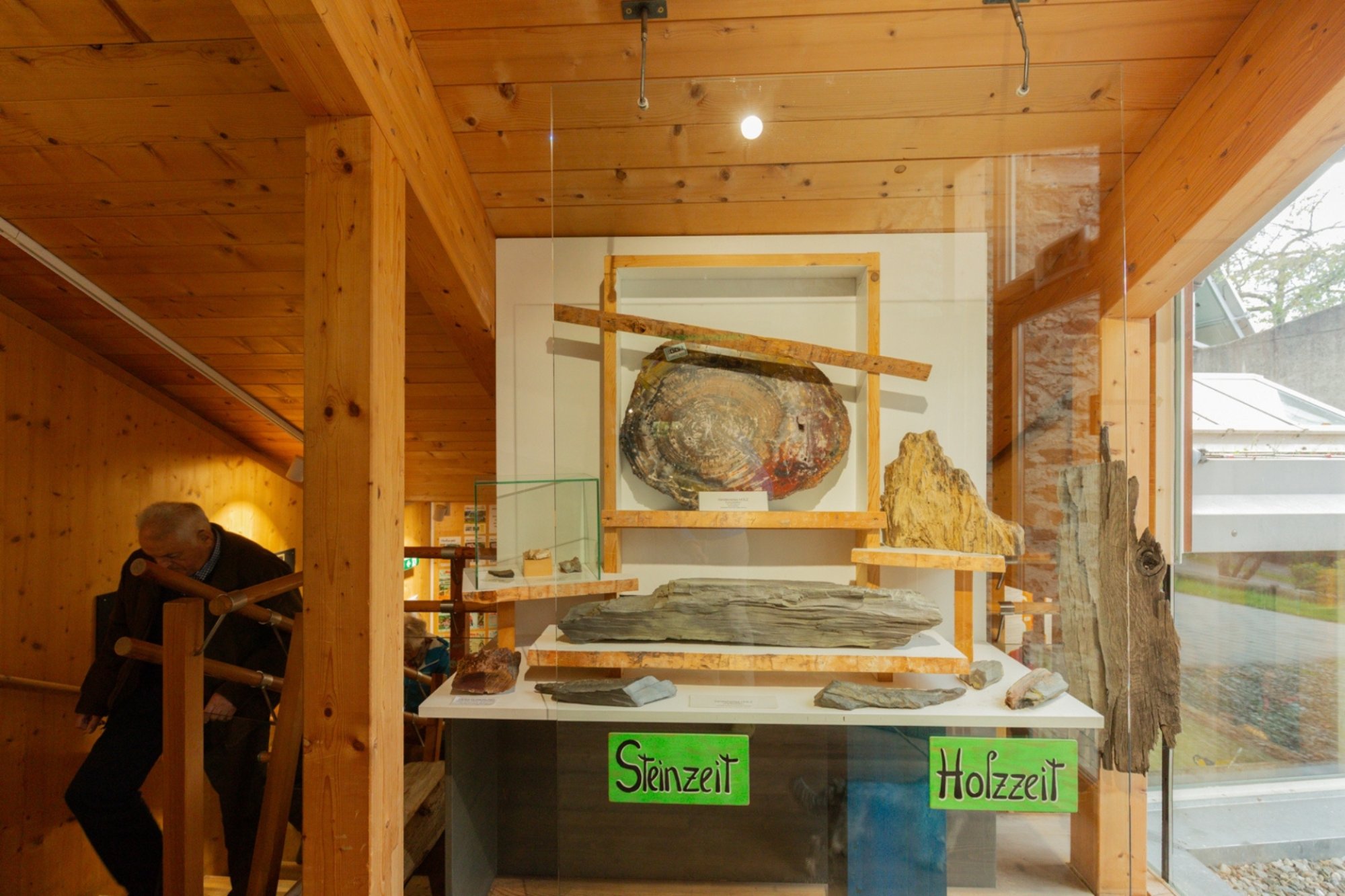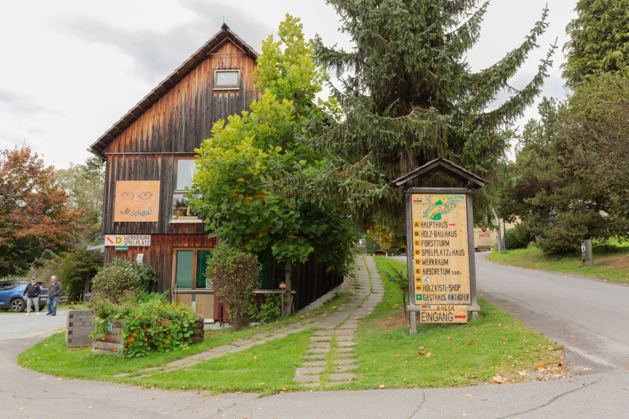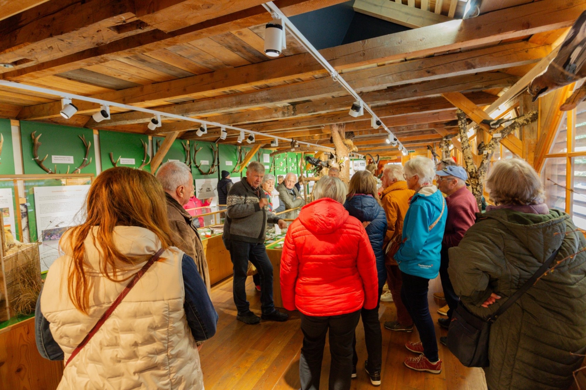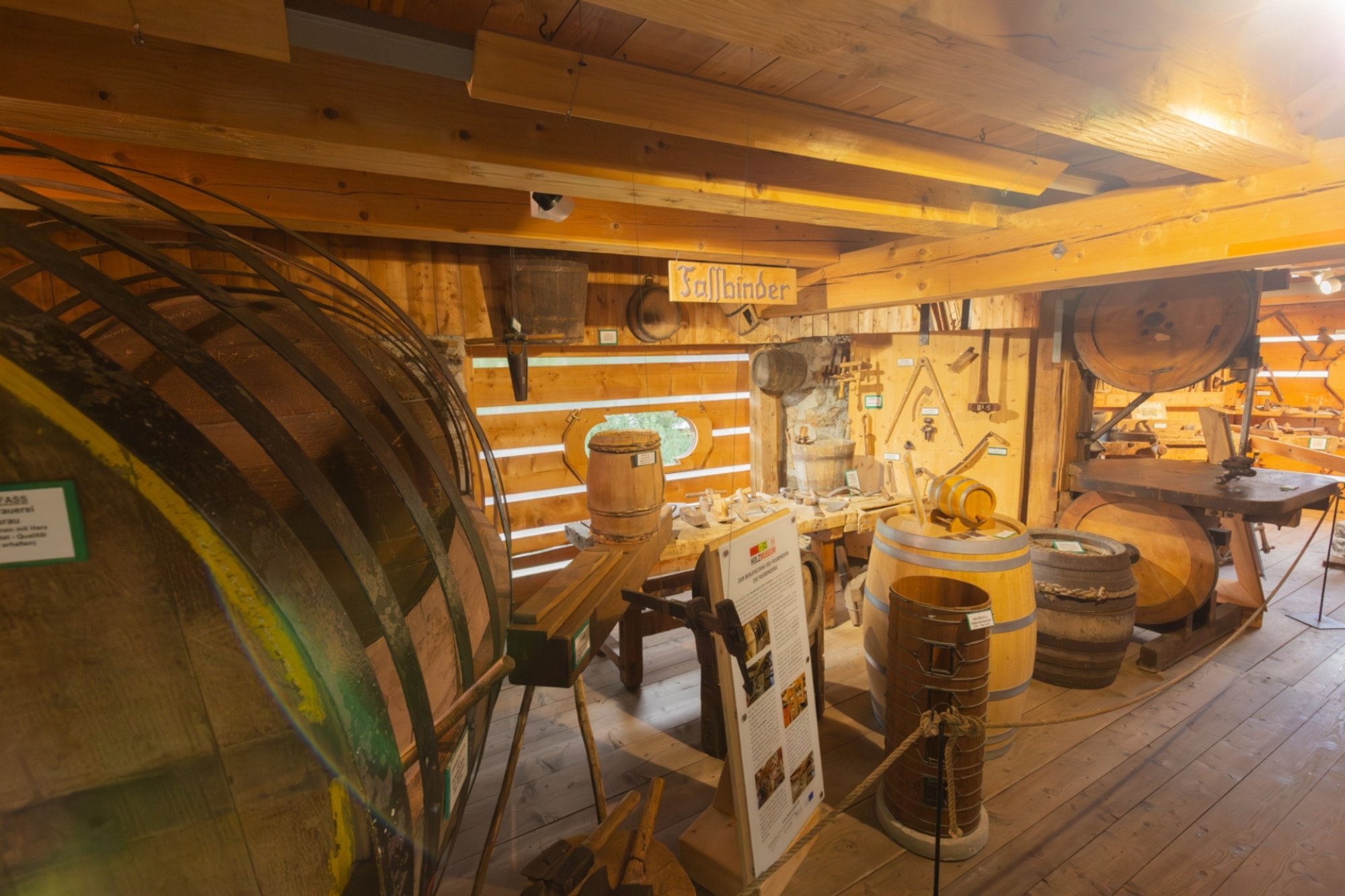 Stolz präsentiert sich das Holzmuseum mit seinem Dach und der außergewöhnlichen Dachgaube. Wie ein Diamant sticht sie aus dem Dach des Haupthauses, einem ehemaligen Rinderstall, hervor. Ein Symbol, das uns zeigen soll, dass das Traditionelle das Moderne nicht ausschließt. Bei unserem zweistündigen Aufenthalt durften wir eintauchen in eine "Holz-Erlebniswelt" auf 10.000 m² Gesamtfläche im Innen- und Außenbereich.