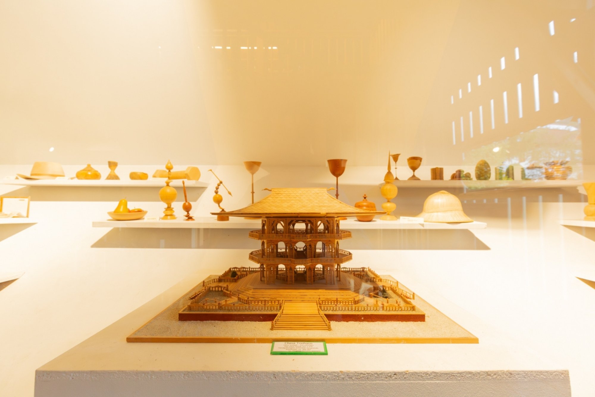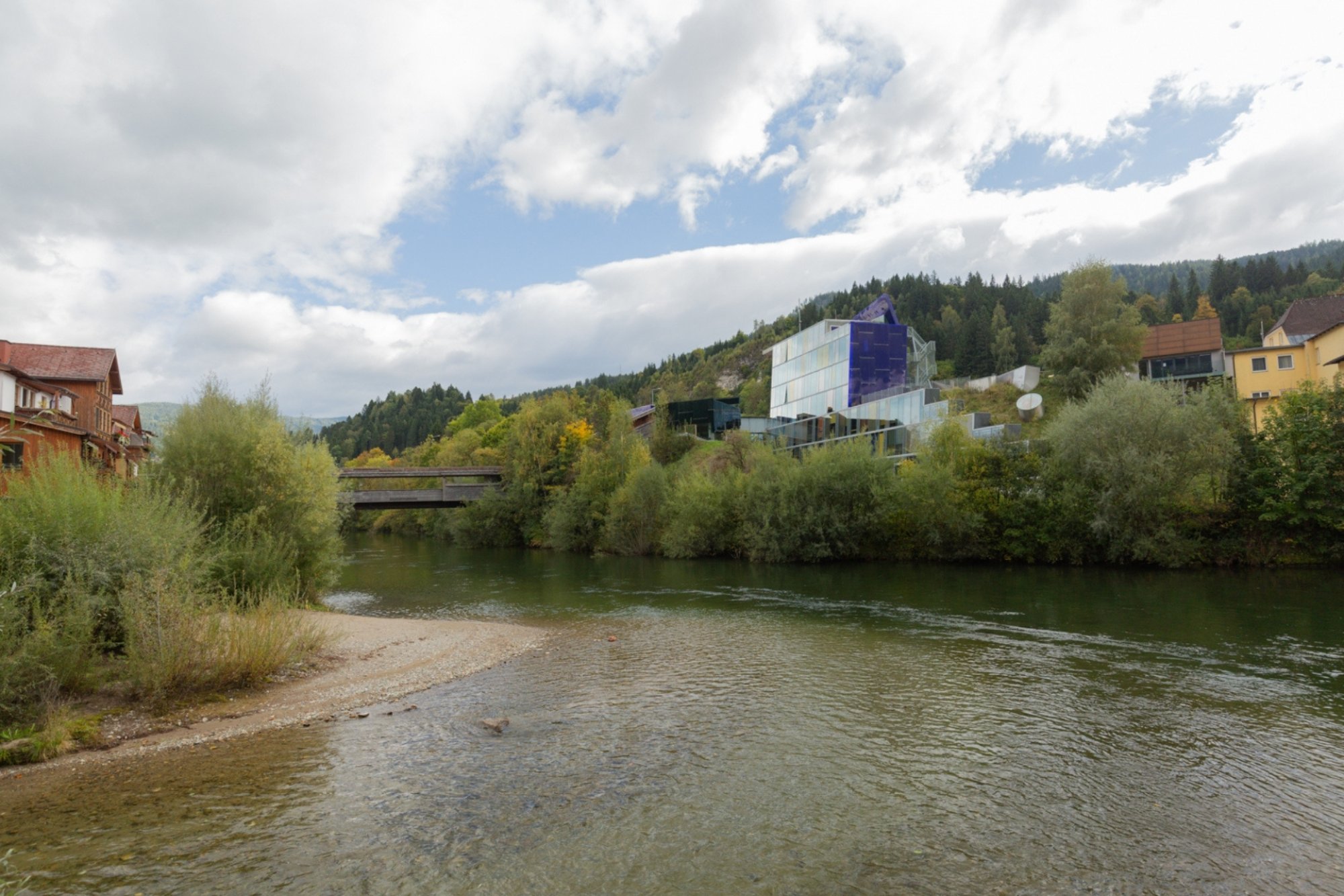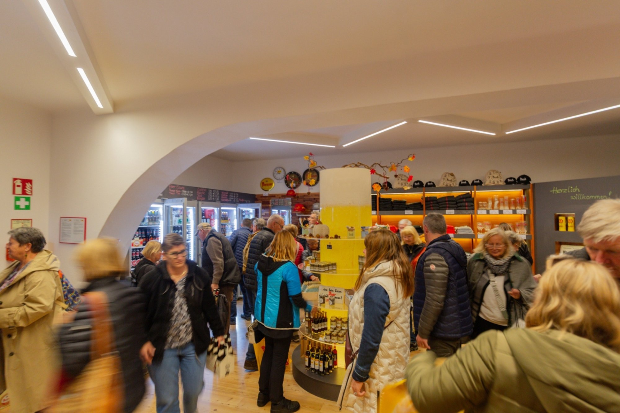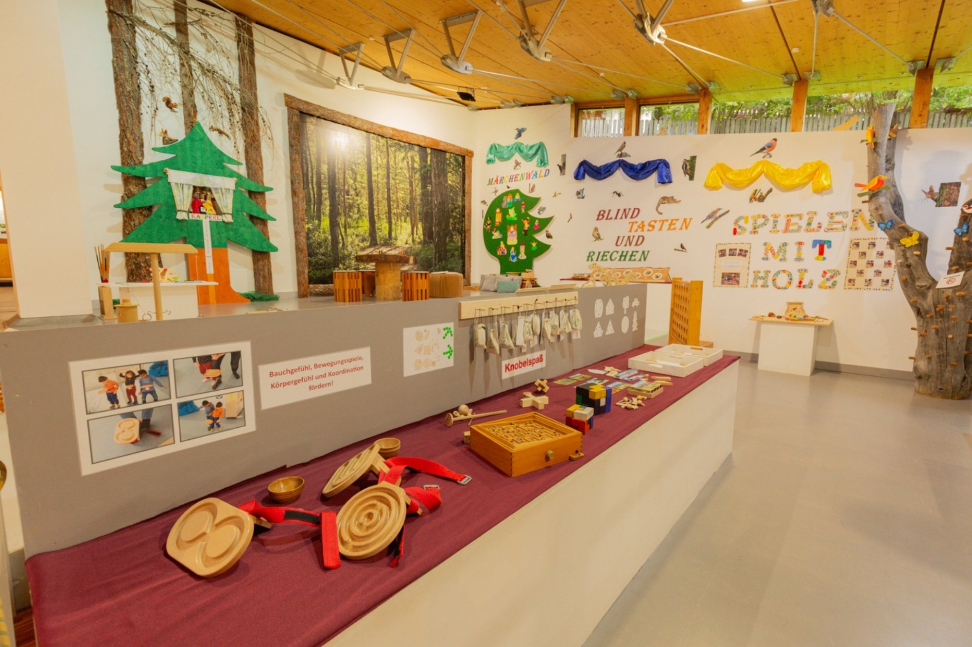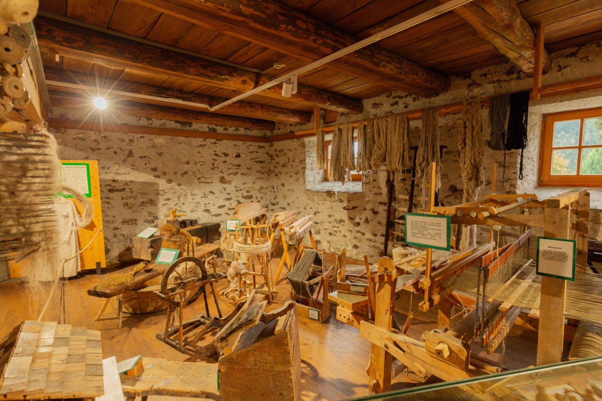 Stolz präsentiert sich das Holzmuseum mit seinem Dach und der außergewöhnlichen Dachgaube. Wie ein Diamant sticht sie aus dem Dach des Haupthauses, einem ehemaligen Rinderstall, hervor. Ein Symbol, das uns zeigen soll, dass das Traditionelle das Moderne nicht ausschließt. Bei unserem zweistündigen Aufenthalt durften wir eintauchen in eine "Holz-Erlebniswelt" auf 10.000 m² Gesamtfläche im Innen- und Außenbereich.