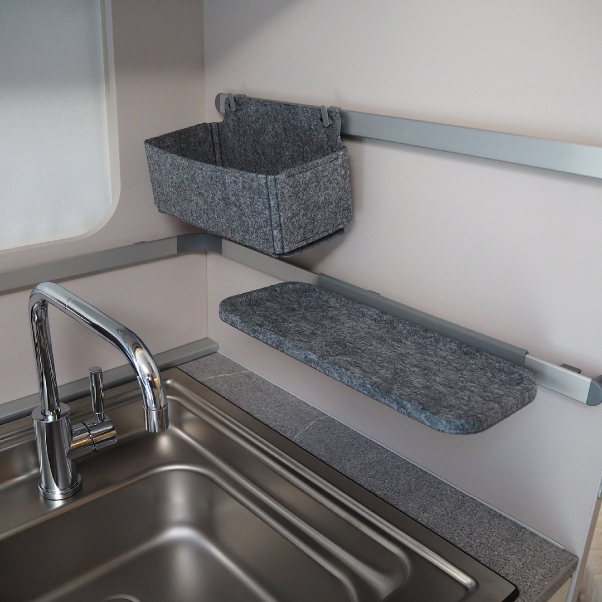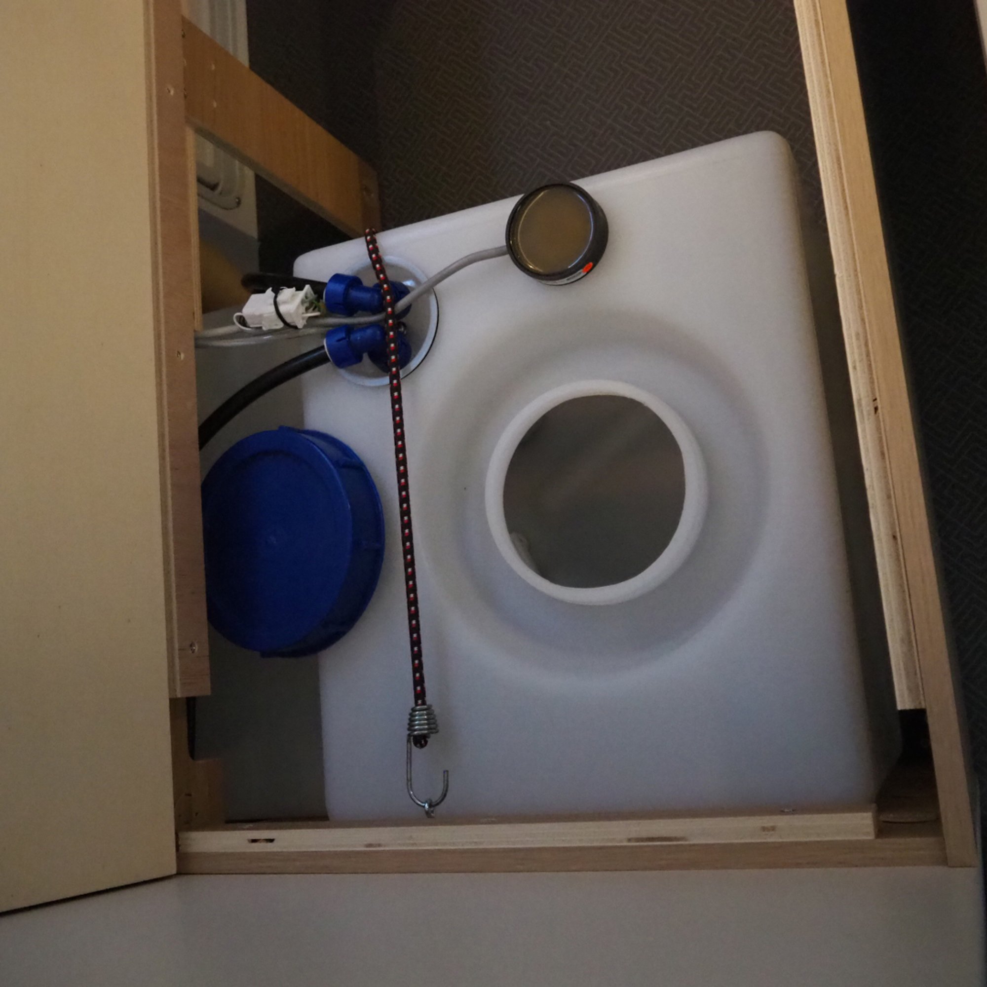 Der Küchenblock ist links vom Einstieg und umfasst eine Edelstahlspüle, einen Drei-Flammen-Herd mit Glasabdeckung, einen Dunstabzug, eine Mikrowelle und einen 140-Liter-Kühlschrank sowie einen Unterbau-Kühlschrank, der mit zwölf Volt, 220 Volt oder Gas betrieben werden kann. Für Lebensmittel bietet der große Apothekerauszug Platz. In der Küche und vielen Bereichen gibt es an den Wänden Aluschienen, in die praktische Ablageboxen eingehängt werden können.Nasszelle ★★★★★