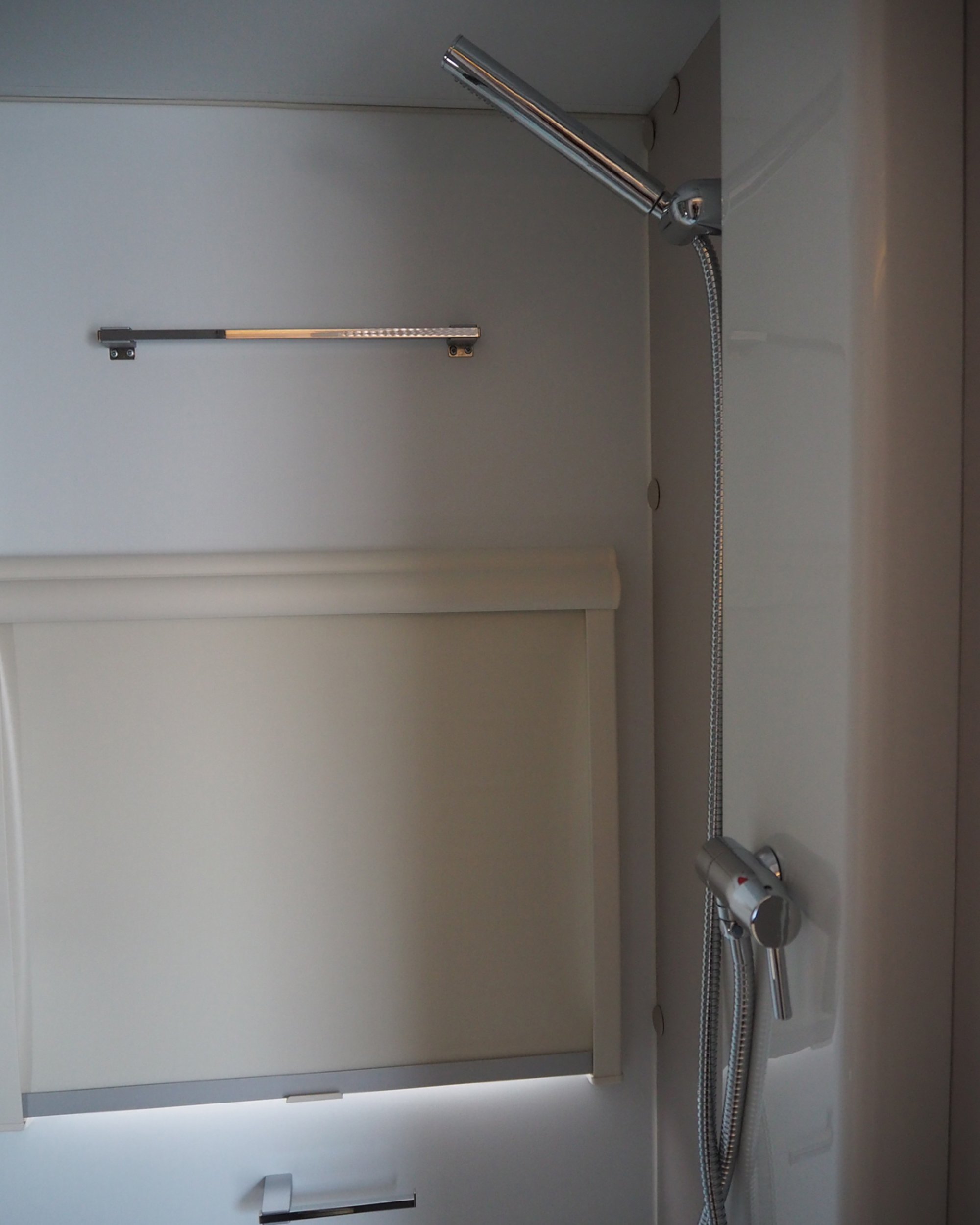 Das Bad ist mit einer vollwertigen Dusche und Duschvorhang ausgestattet. Das Waschbecken ist platzsparend klappbar. Durch das Fenster im Bad kann man den Brausekopf durchreichen, sodass Duschen auch im Freien möglich ist.
