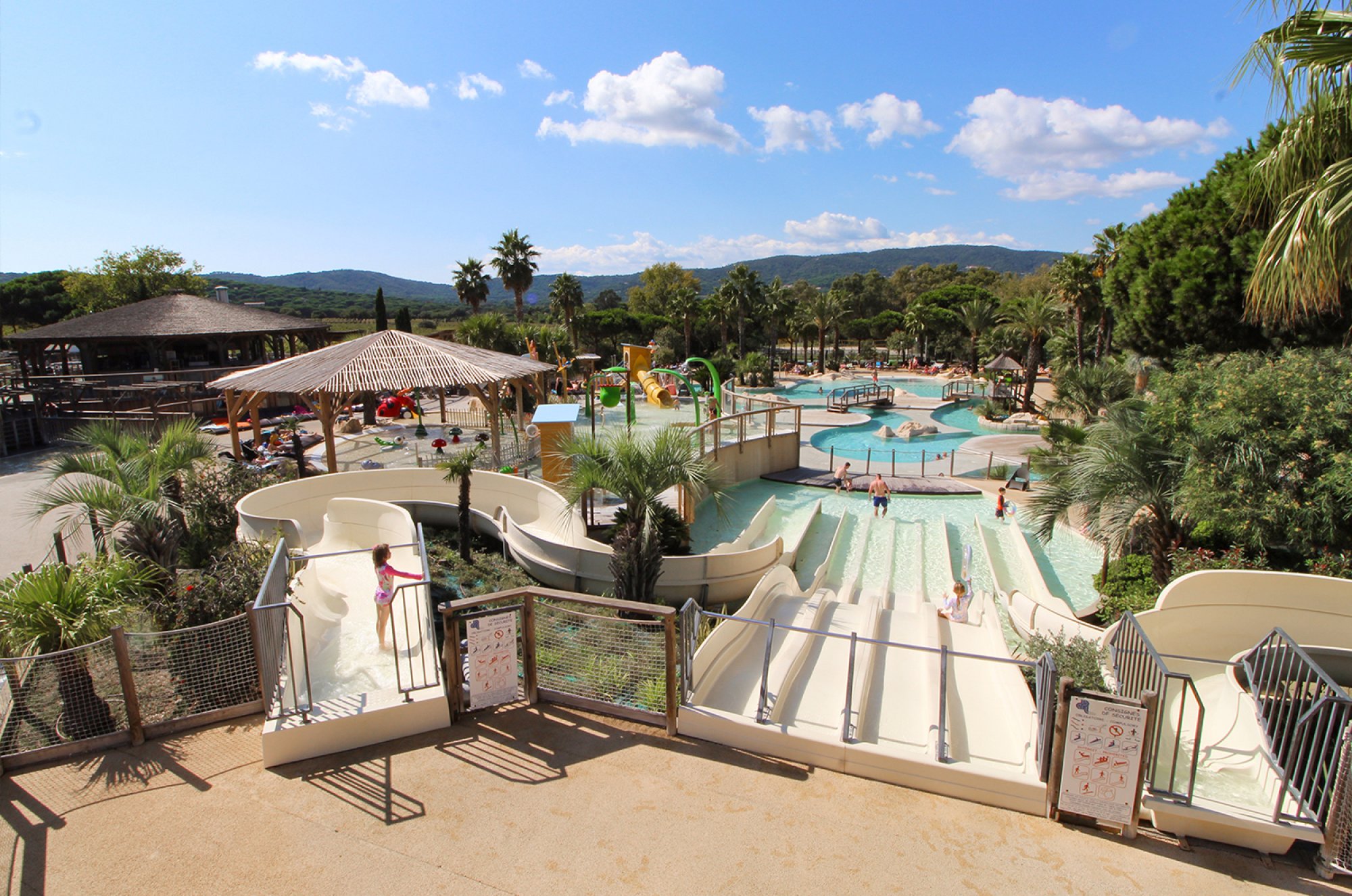 Mehrere auf verschiedenen Ebenen angeordnete Schwimmbäder, eine vierbahnige Wasserrutsche, zwei kurvige Rutschen und ein speziell für die Kleinsten gestalteter Wasserspielbereich, in dem sie nach Herzenslust planschen und im Wasser spielen können – was für ein Badespaß!