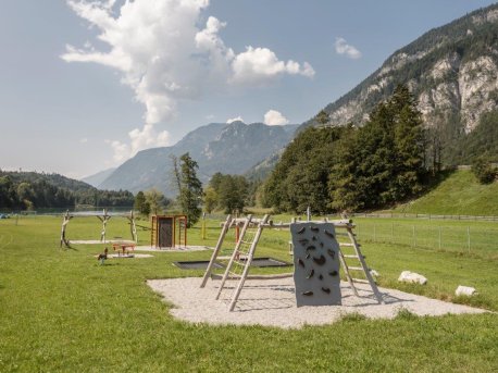 einen großzügig angelegten Spielplatz mit Fußballtoren, Gokarts und einen Streichelzoo.