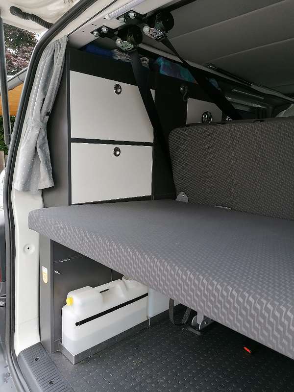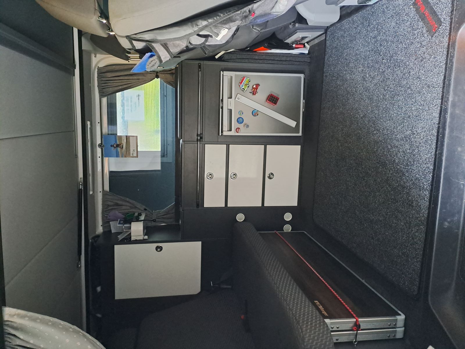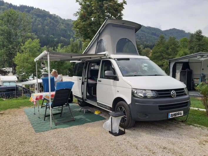 Dieser T5 wurde 2018 von Summermobil sehr hochwertig und komplett ausgebaut. Webasto Standheizung, Dometic Kühlschrank, Steckdosen 230 V und einige USB, Android-Radio mit Navi CD und DVD, Drehsitz, Versorgungsbatterie, Rückfahrkamera, Alufelgen mit fast neuen Sommerreifen, Winterreifen auf Stahlfelgen, Markise Fiamma 45S mit Rafter, bei Bedarf das abgebildete Berger-Vorzelt Air, es kann mittels Keder direkt an der Markise befestigt werden, Anhängekupplung, Lattenrost im Hochbett. Besonderheit: Obwohl mit Kästen ausgebaut, ist er trotzdem für 5 Personen typisiert. Die Sitzbank hat 3 x 3-Punkt-Gurte und kann zum Bett umgelegt werden. Somit gibt es 4 Schlafplätze für Erwachsene. Kilometerstand 155000, servicegepflegt.