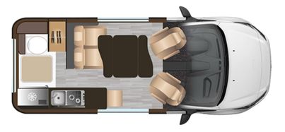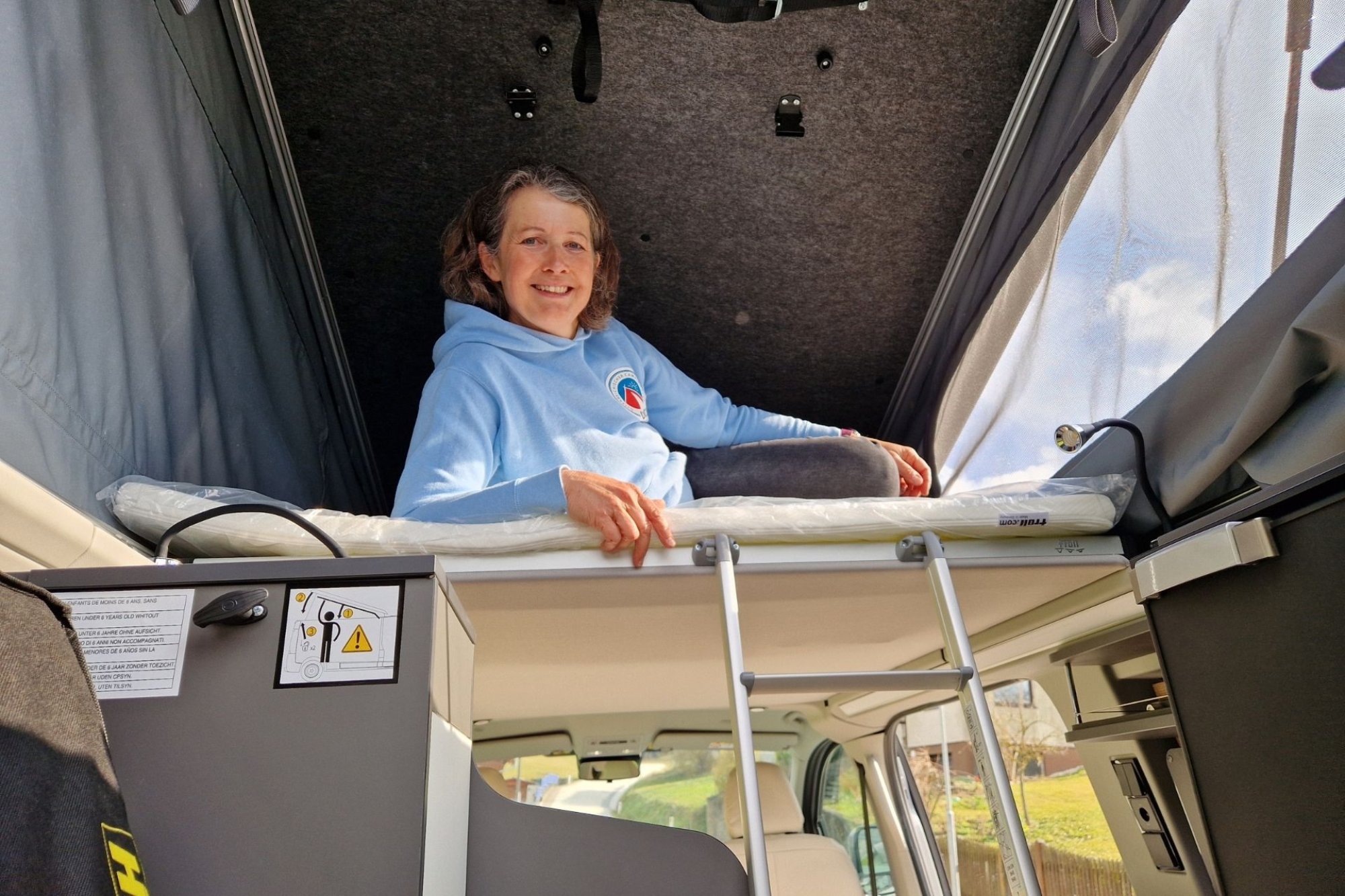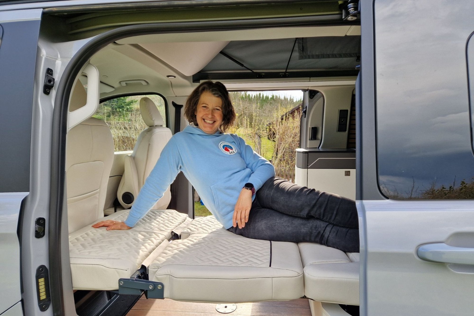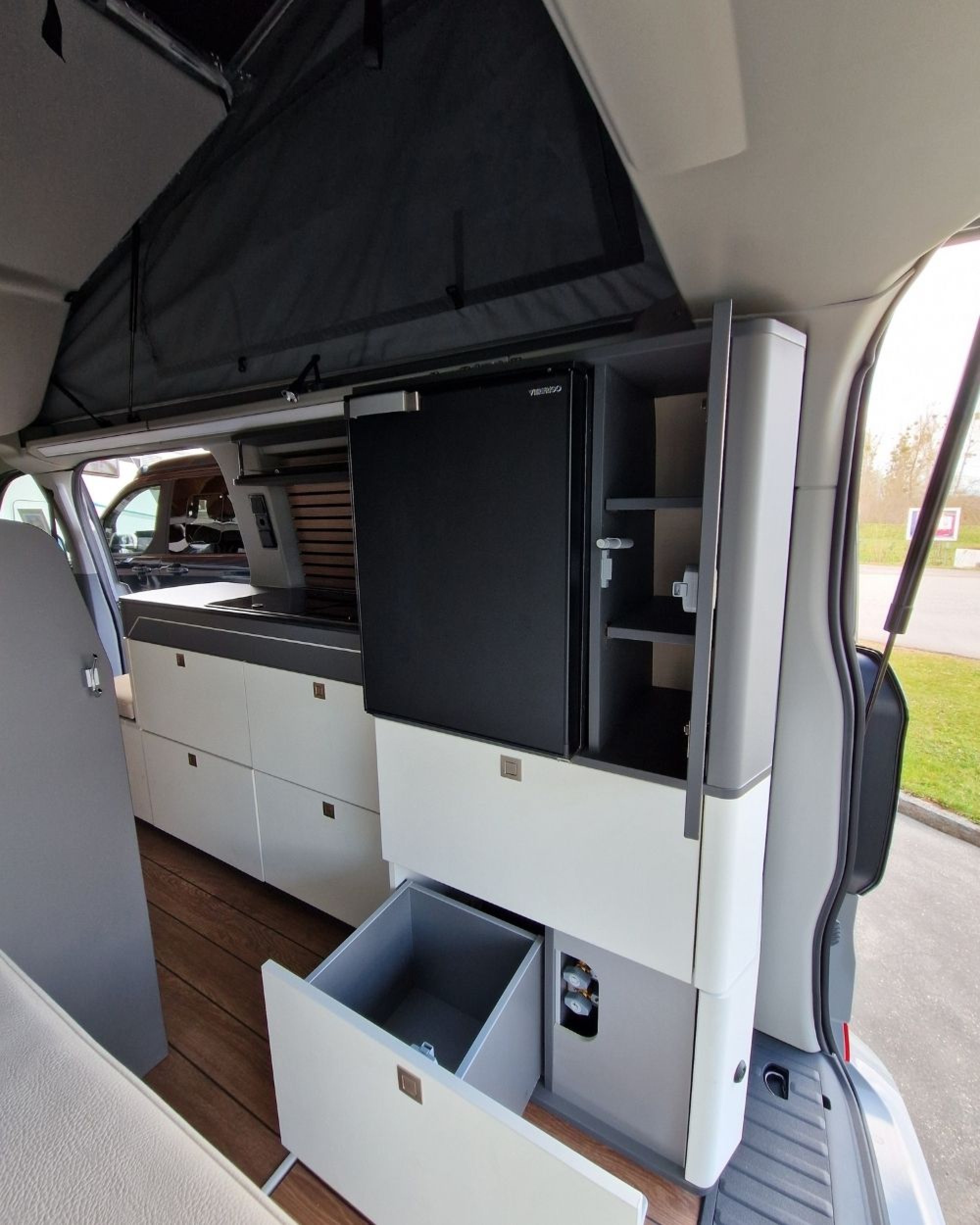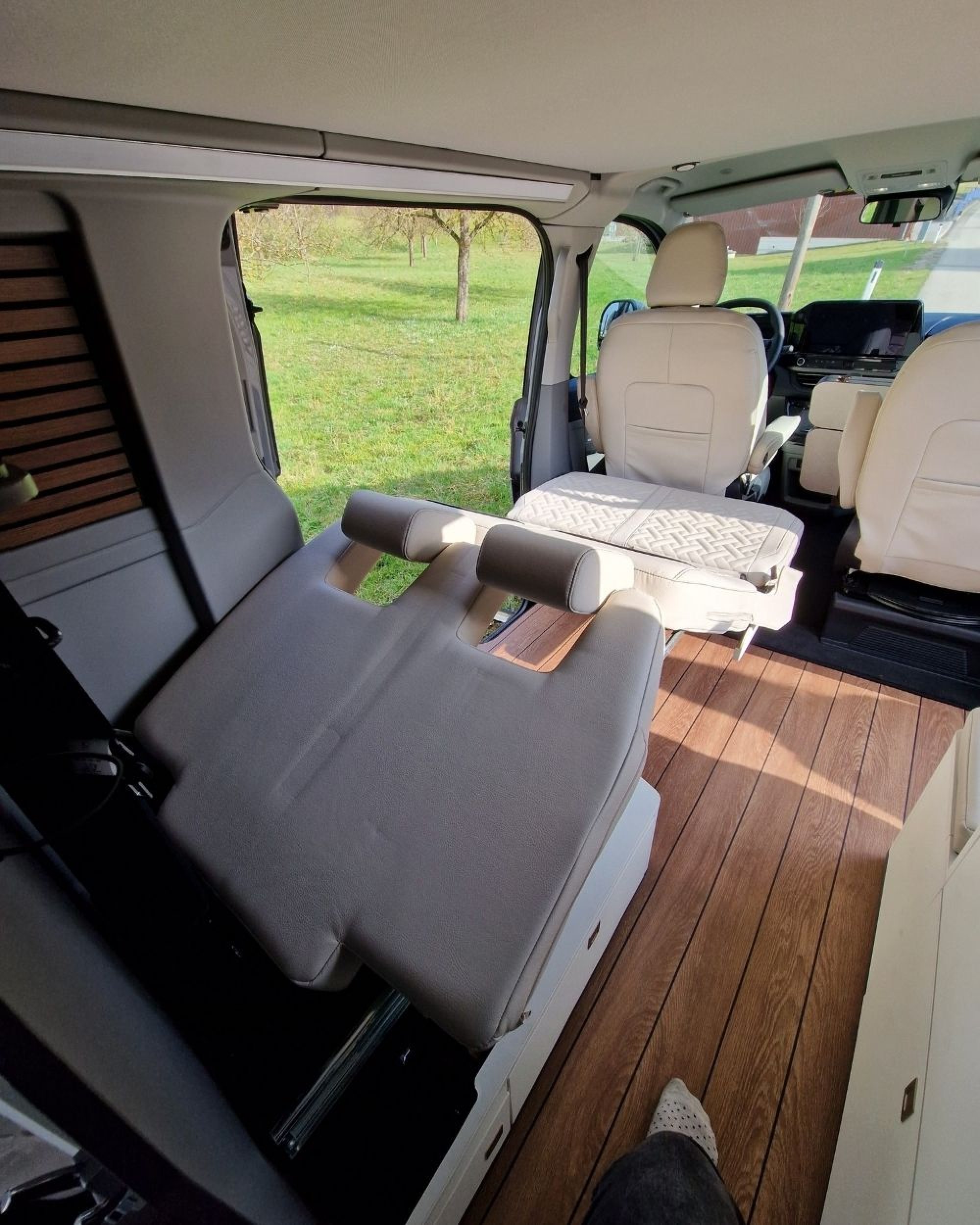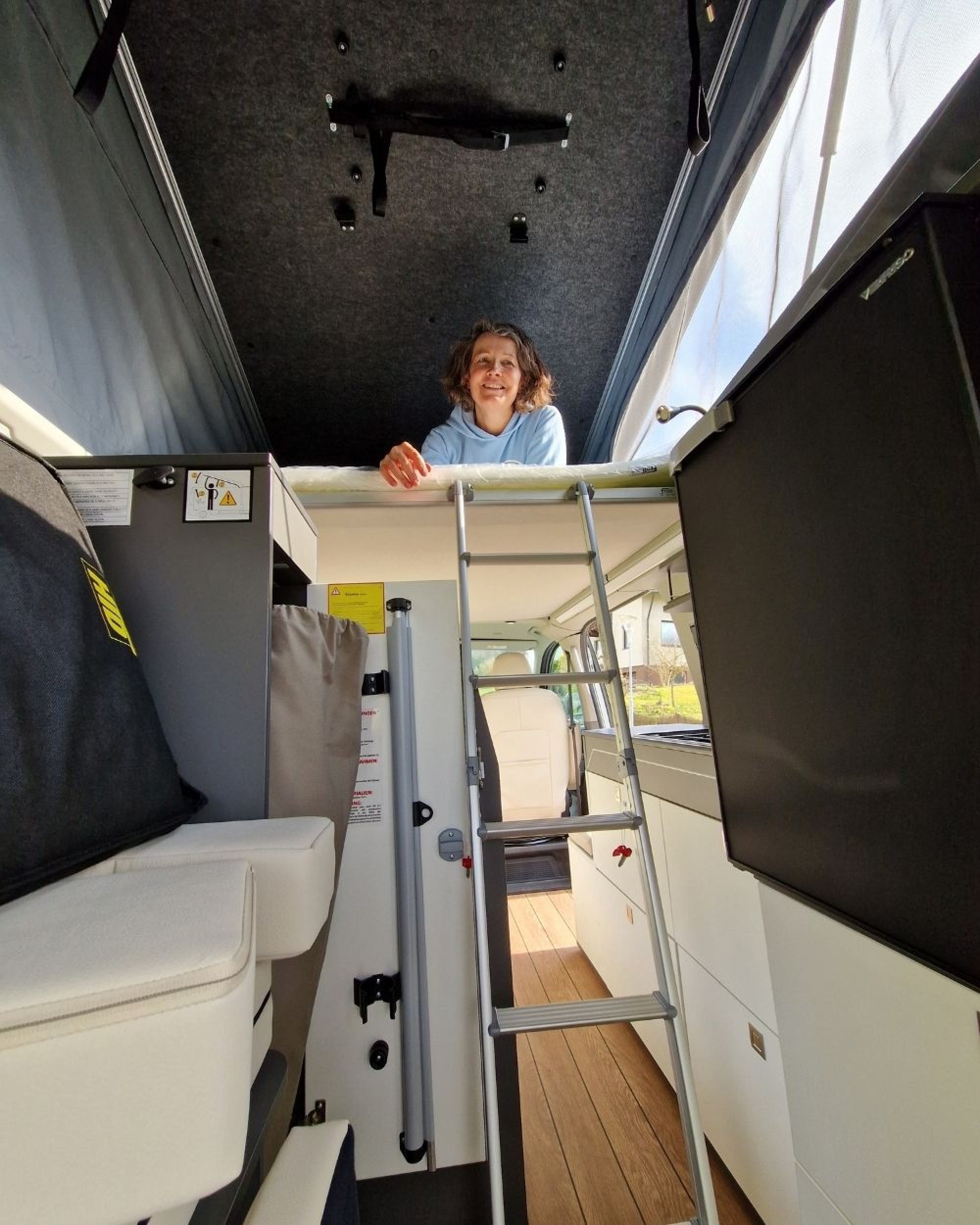 Auf der Sitzbank gibt es bei einem Platz eine ISOFIX-Halterung für Kindersitze. Das Sonderpaket „Ready“, welches im vorgestellten Fahrzeug inkludiert ist, beinhaltet eine Kraftstoffheizung von Eberspächer und eine Isolierung für die Dachplane des Aufstelldachs für Reisen während der kühleren Jahreszeit. Ausreichend Platz zum Essen, Arbeiten oder Spielen bietet die Sitzgruppe, die aus der Bank und den Vordersitzen entsteht. Per Knopfdruck lässt sich die Bank mit der Lehne elektrisch in die Waagrechte bringen. Mit den Auszügen auf der Seite und zusätzlichen Polstern entsteht so eine Liegefläche von 1,24 mal 1,93 Metern. Etwas mehr Platz gibt es im Dachbett mit 1,30 mal 2,08 Metern. Der Aufstieg ist sehr bequem über eine Leiter im Heck möglich. Verdunkelungsrollos im Dach garantieren einen erholsamen Schlaf. Ein Hocker, der an den Küchenblock anschließt, bietet einen weiteren Sitzplatz sowie Stauraum darunter. Praktisch sind die Schwanenhalsleuchten, die im Fahrzeug gut verteilt sind. Der Tisch lässt sich durch zwei zusätzliche Holzplatten, die man hochklappen kann, zu ansehnlicher Größe erweitern.Das Holzdekor, das die vorige Generation der Dreamer zierte, ist verschwunden, und helle Oberflächen mit dunklen Akzenten haben Einzug gehalten. Geblieben ist lediglich der Boden im Holzdielen-Dekor. Im Sonderausstattungspaket sind ein Tisch und zwei Sessel mit dabei.