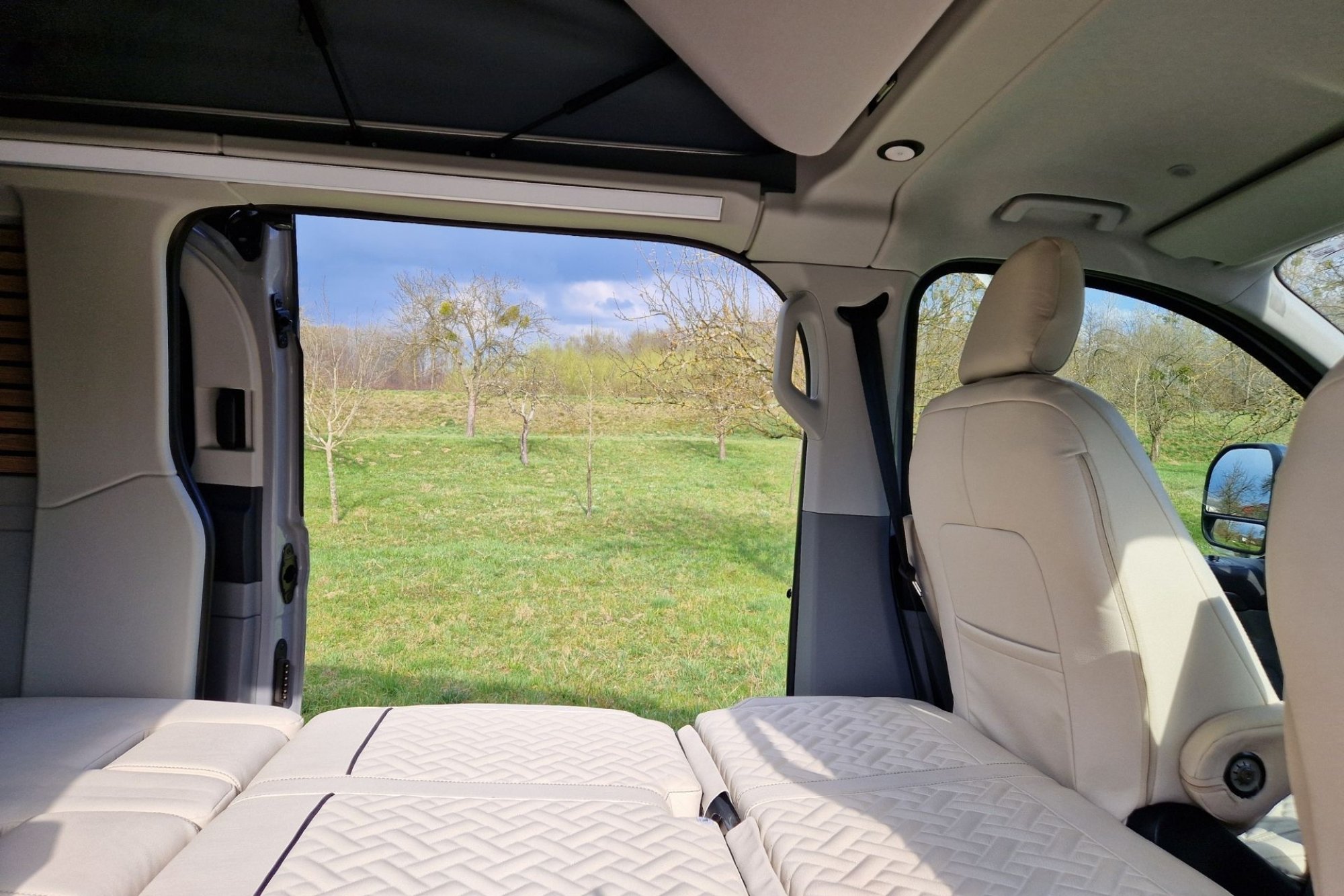 Als Basisfahrzeug dient der Ford Custom mit einem EcoBlue Zwei-Liter- und 136-PS-Motor. Ein Automatikgetriebe, die gängigen Fahrsicherheitsassistenzsysteme und eine Rückfahrkamera gehören hier zur Standardausstattung – ebenso wie die Klimaanlage und der schlüssellose Zugang. Die beiden Fahrerhaussitze sind praktischerweise drehbar. Inkludiert ist ein Infotainmentsystem mit einem Multifunktionsdisplay inklusive Apple-Car- und Android-Auto-Funktionen. Die 19-Zoll-Alufelgen gehören zur Sonderausstattung des Sonderpakets „Ready“.Aufbau ★★★★★