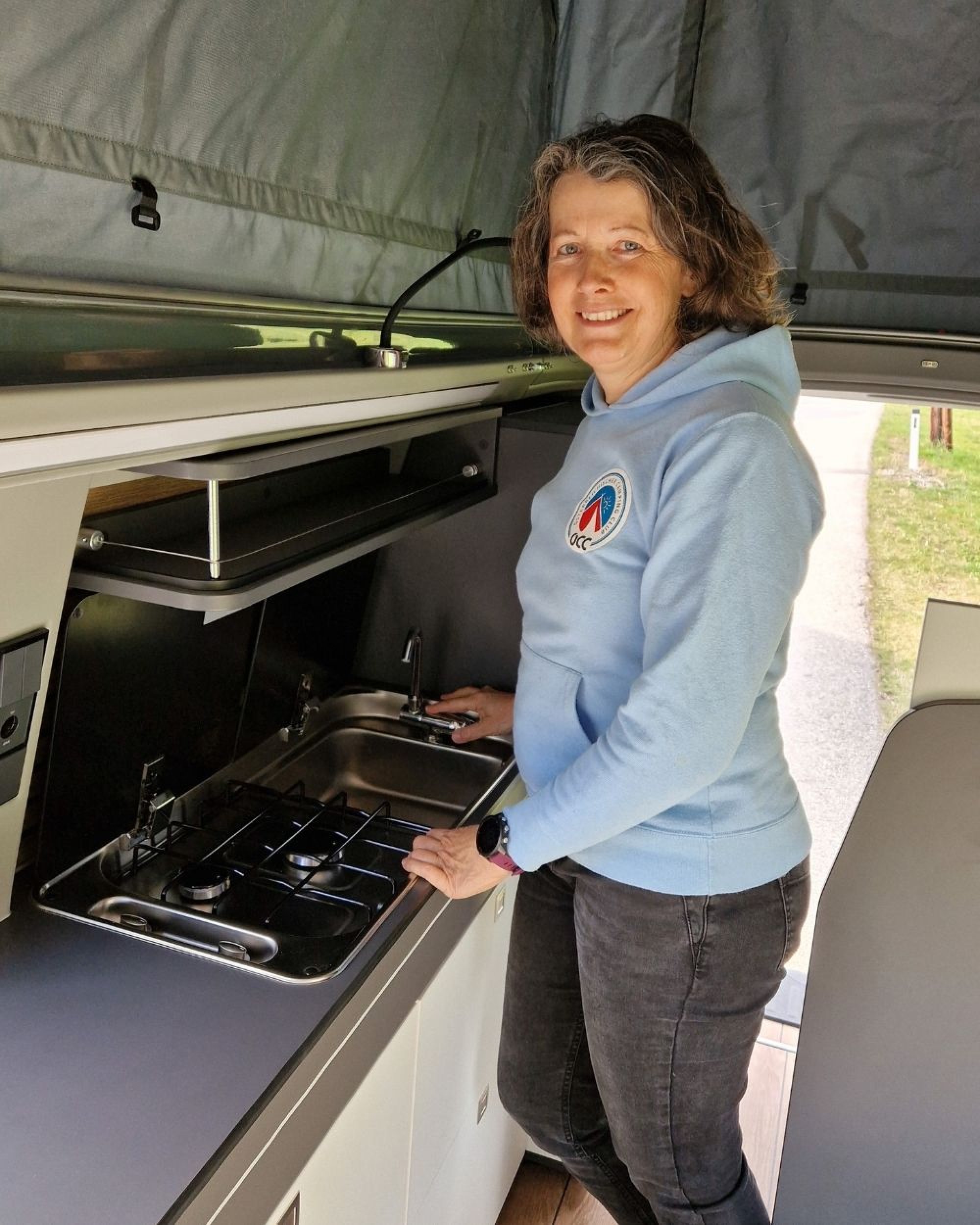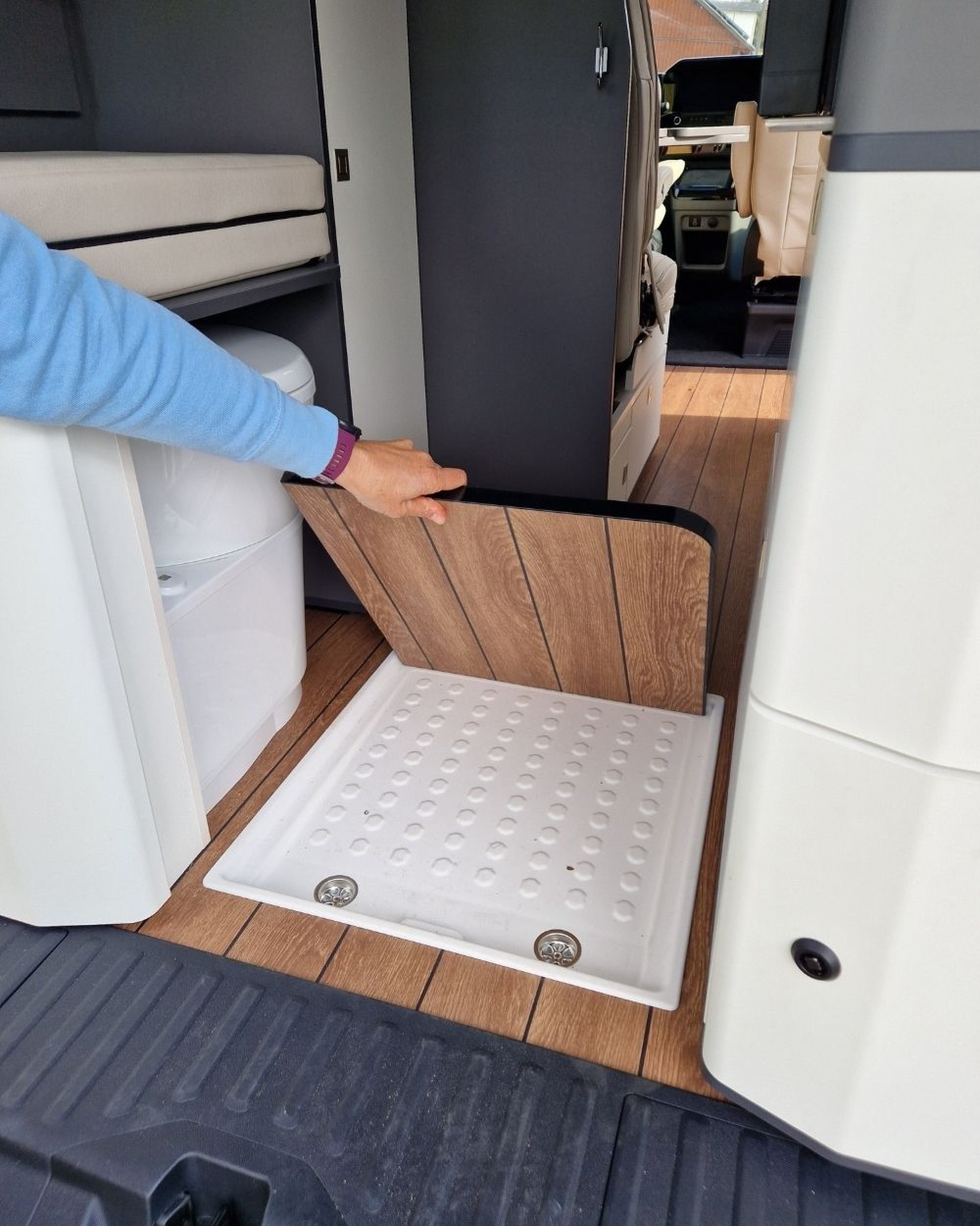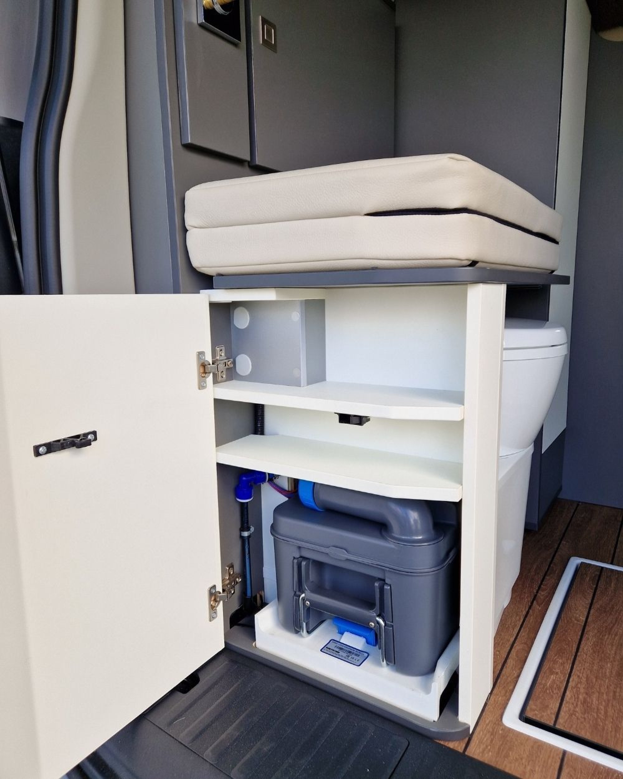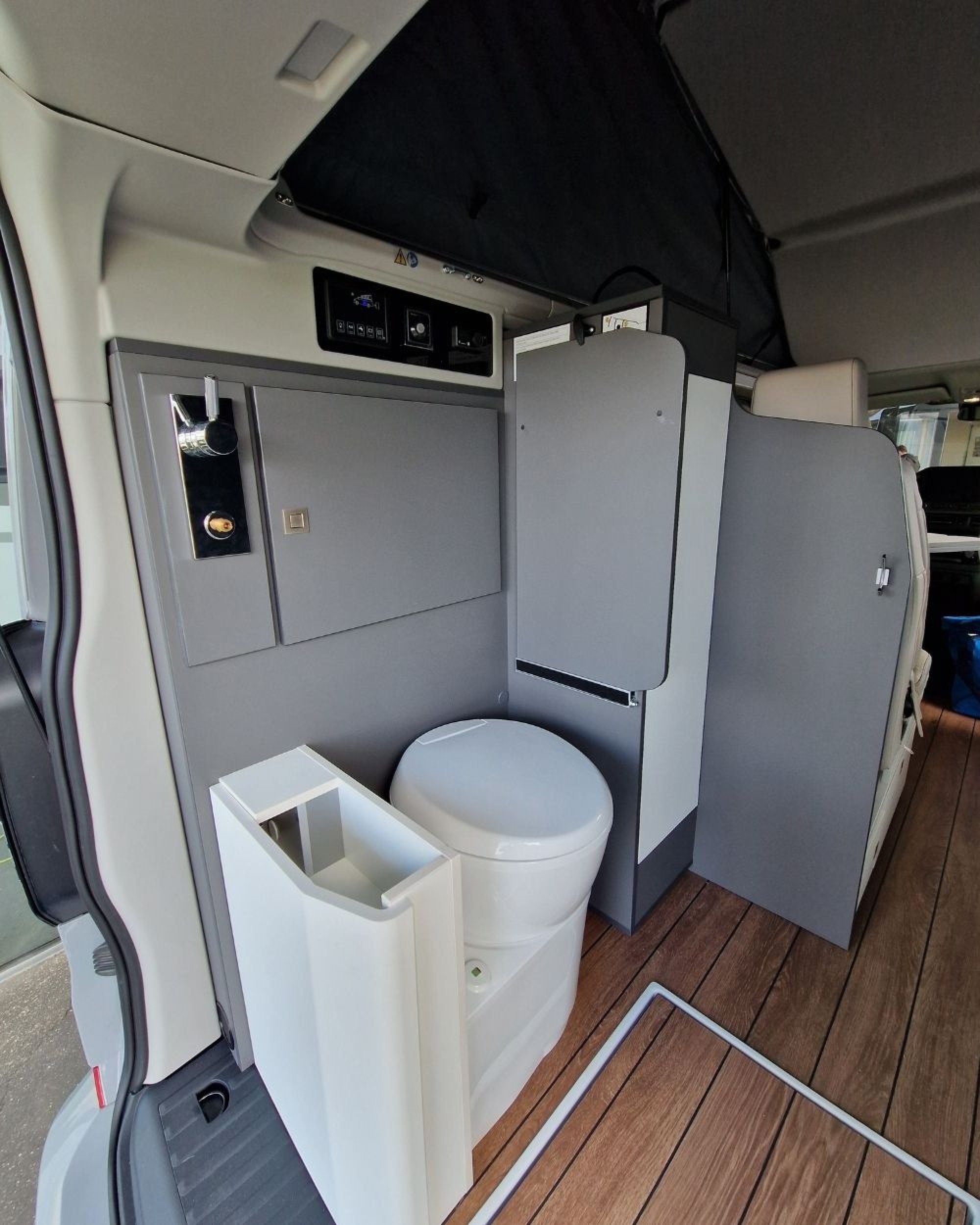 Die Küche bietet erstaunlich viel Stauraum für einen Campervan in dieser Klasse. Der Kühlschrank ist in einer angenehmen Höhe montiert, sodass man an den Inhalt gelangt, ohne sich zu bücken. Ein Zwei-Flammen-Gasherd und eine kleine Abwäsche sowie eine großzügige Arbeitsfläche sind ausreichend, um kleinere Mahlzeiten zu kochen. Zwei Laden nehmen Kochgeschirr und Lebensmittel auf. Richtig gut finden wir die seitlich unter der Arbeitsfläche angebrachte Besteckschublade. In der Ablage über dem Herd lassen sich Gewürze verstauen.Nasszelle ★★★