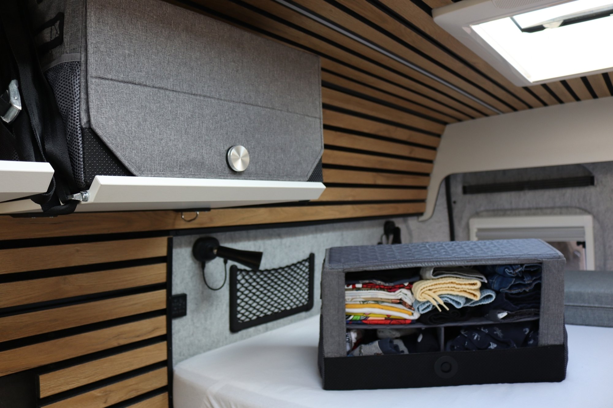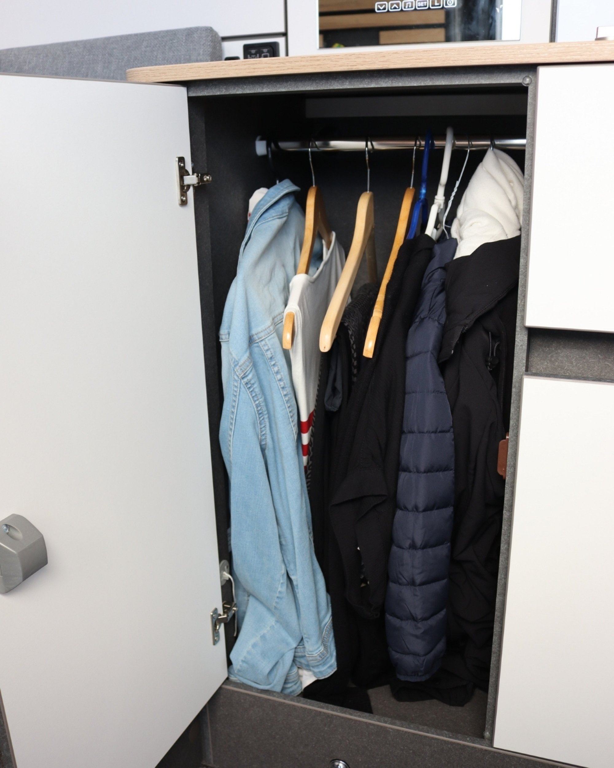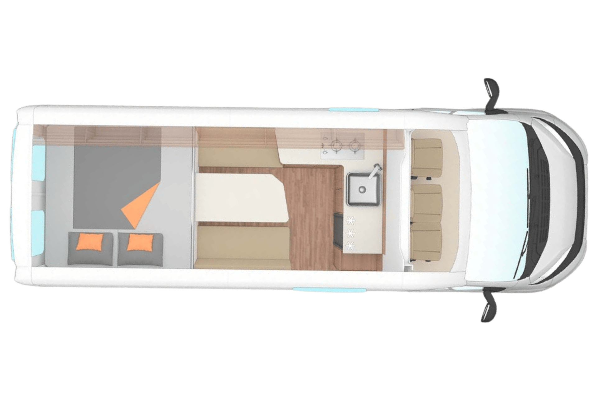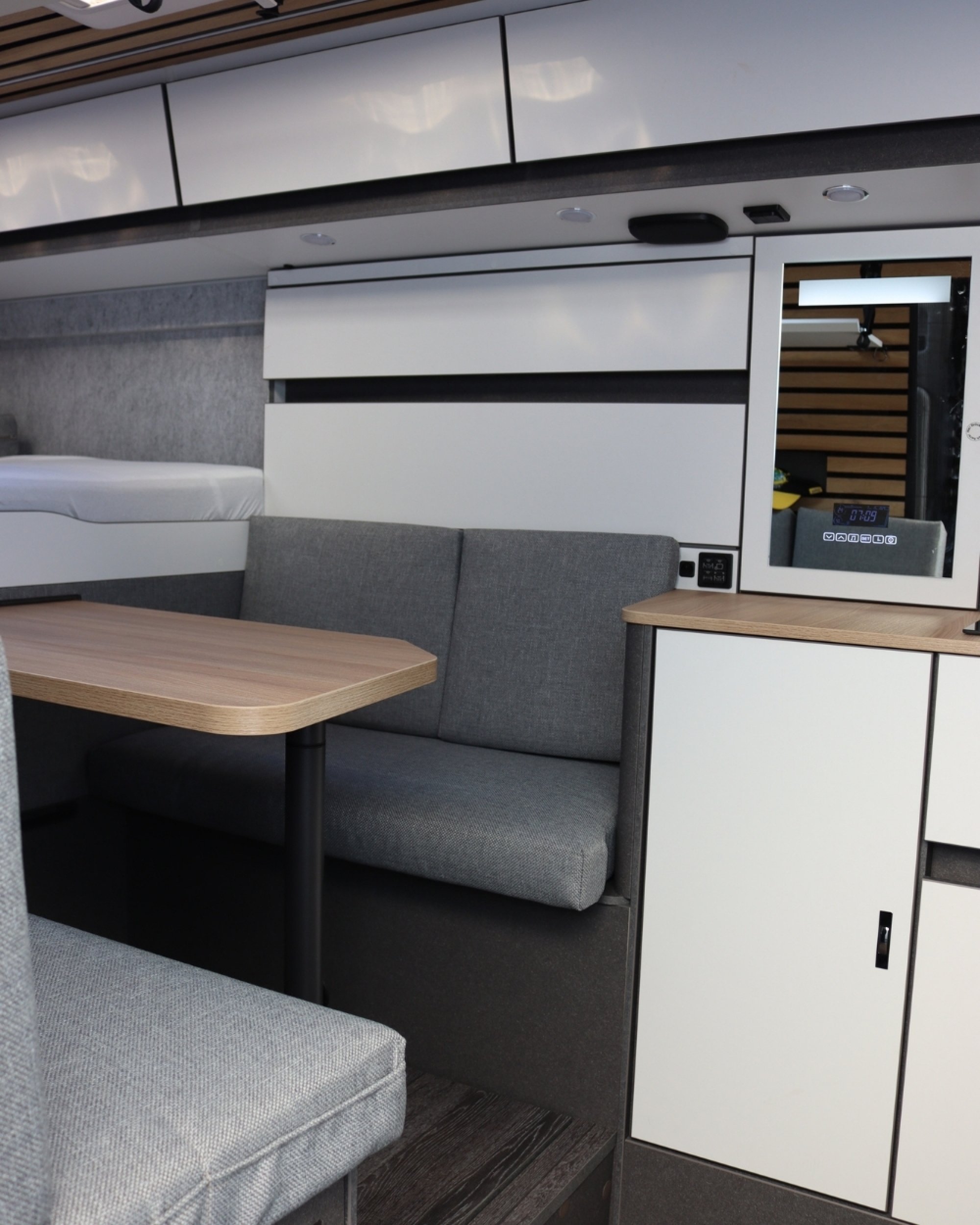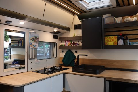 Auffällig ist die moderne Wandverkleidung im Stil von Akustikpaneelen. Die Holzdesign-Streifen samt LED-Licht und Schienensystem setzen Akzente. Haken, Gurte oder Karabiner lassen sich flexibel platzieren. Geschlafen wird im ca. 160 mal 200 Zentimeter großen Querbett, das auf 210 Zentimeter erweiterbar ist. Die Schaummatratze liegt auf einem Alulattenrost. Die Faceto- Face Sitzgruppe mit verschiebbarem Tisch ist praktisch. Stauraum gibt’s in Klappen, Rückwandfächern und Bett-Netzen. Mobile Stoffboxen mit Griff erleichtern das Packen. Der „Smart Mirror“-Schrank mit Uhr und Stauraum ist ein Blickfang.Küche ★★★★★