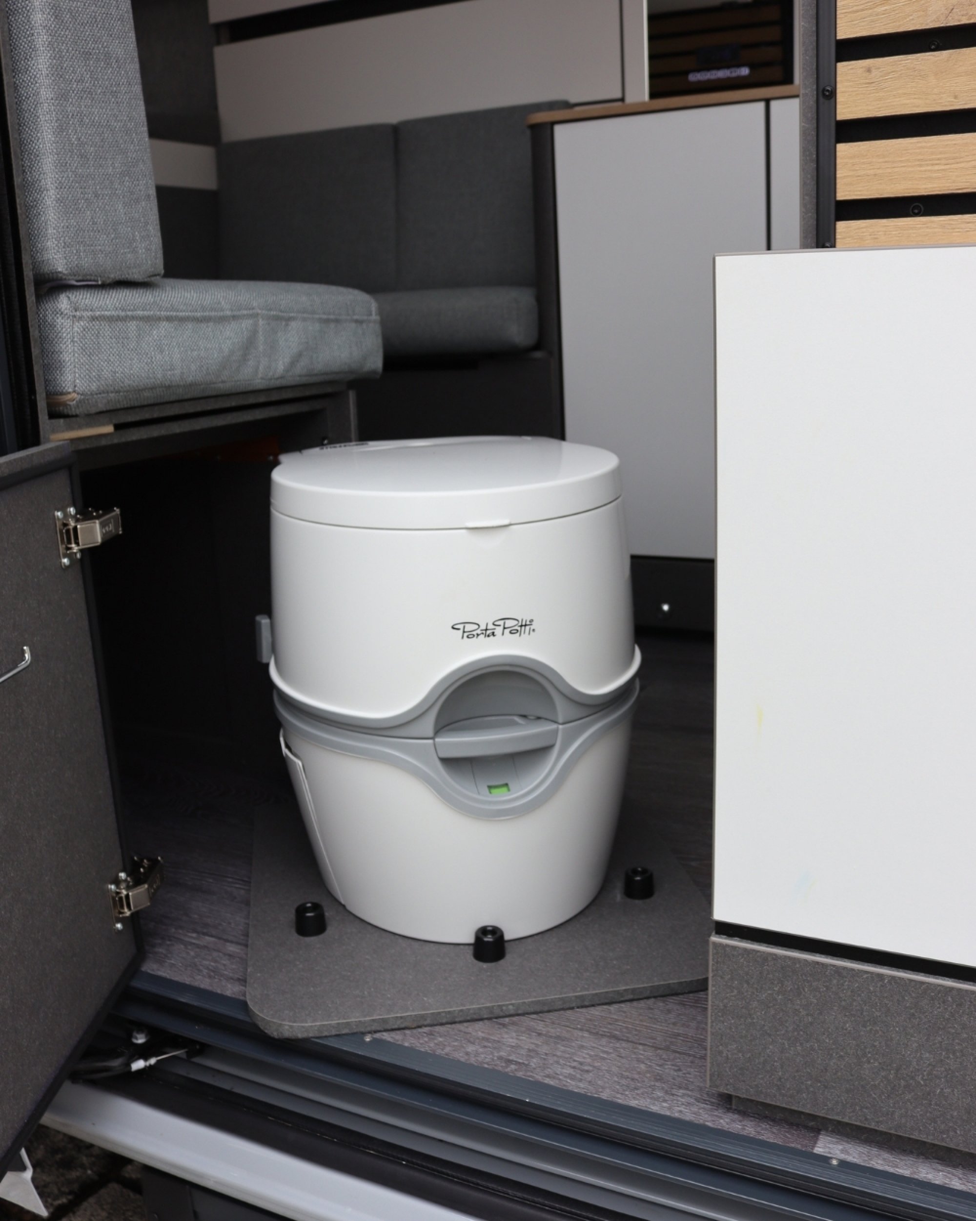 Die textile faltbare Duschkabine im Boden ist schnell auf- und abgebaut. Der Tisch wird eingeschoben und die Duschwanne im Boden geöffnet. An den Haken lassen sich der Duschvorhang sowie der Brausekopf einfach einhängen. Clever ist, dass sich die Dusche direkt unter einem Midi-Heki befindet, was zum Trocknen vor dem Verstauen hilfreich ist. Bei der Außendusche am Heck wäre ein Haken zur Befestigung eine sinnvolle Ergänzung. Eine Porta-Potti-Toilette von Thetford verschwindet unter der Sitzbank. Hier könnte jedoch noch am Ein- bzw. Ausziehsystem gefeilt werden, da dies bei unserem Testfahrzeug leider oft klemmte.
