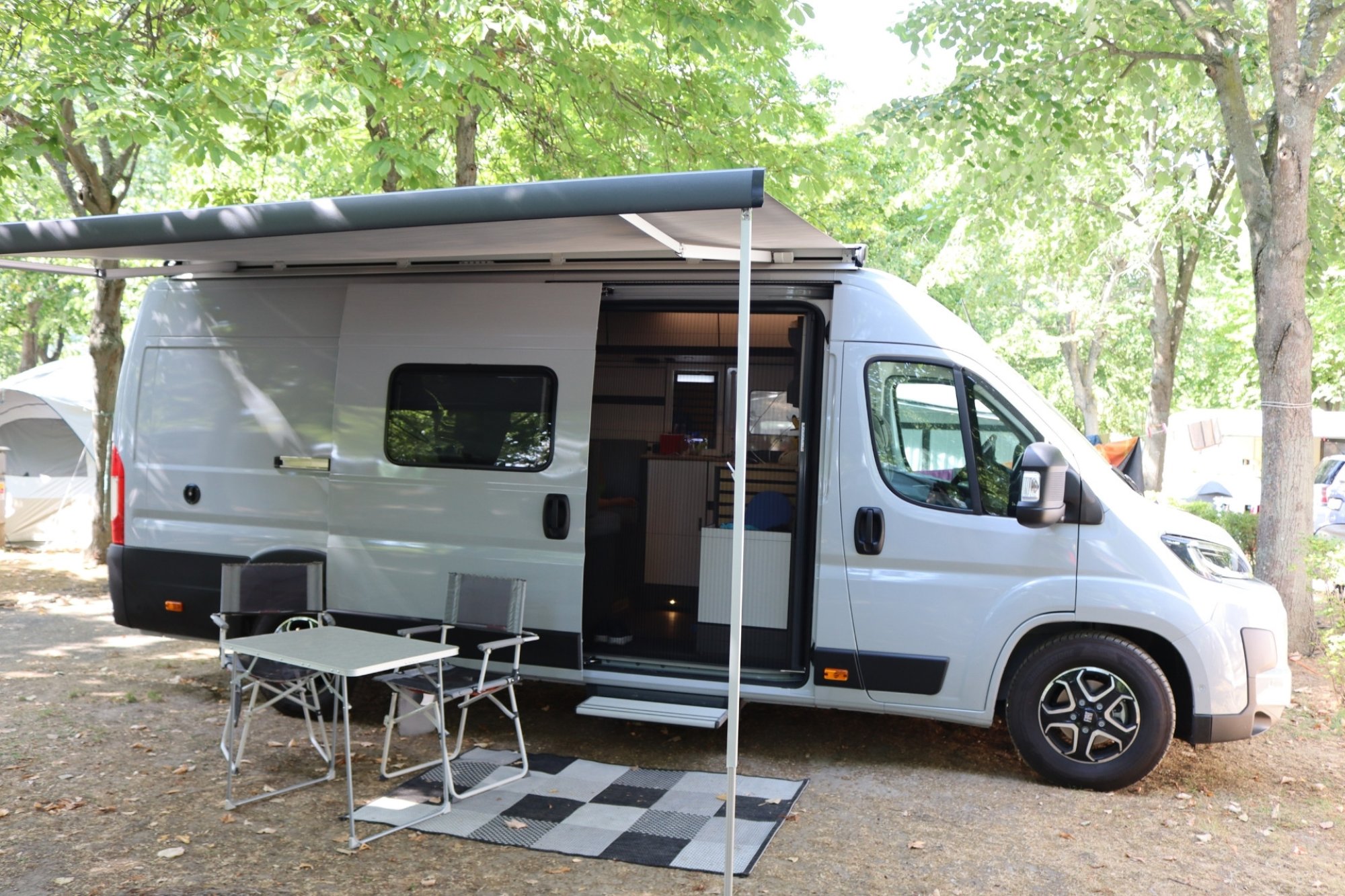 Als Basis dient ein Fiat Ducato, der in den leistungsstarken Varianten mit 140 oder 180 PS erhältlich ist. Die 8-Stufen-Wandlerautomatik ermöglicht ein entspanntes Fahren. Unser Testfahrzeug ist mit jeglicher moderner Technik ausgestattet: Spurhalteassistent, Verkehrszeichenund Müdigkeitserkennung. All das und natürlich der Tempomat bieten optimalen Fahrkomfort. In der abgetrennten Fahrerkabine mit einem Fahrersitz und einer Doppelbeifahrer-Sitzbank können drei Personen Platz nehmen. Über den 10-Zoll- Touchscreen lassen sich das Soundsystem, die Klimaanlage und das Navigationssystem bequem steuern. In der Fahrerkabine finden wir zahlreiche Ablagemöglichkeiten, Getränkehalter sowie USB-Steckdosen. Besonders gefällt uns der digitale Rückspiegel, der das Bild der Rückfahrkamera in perfekter Auflösung überträgt. Unser Testfahrzeug kommt in der eleganten Sonderlackierung Lanzarote grey mit dezenter Beschriftung, was sehr ansprechend ist.Aufbau ★★★★★
